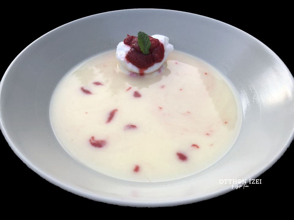 • A tálalásnál a jéghideg leveshez adunk egy kis epervelőt, majd rákerül a habgaluska is.