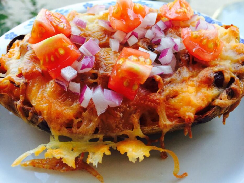 Az édesburgonya krémes állaga nagyon jól harmonizál a sajtok összességével és a friss zöldségekkel a tetején.