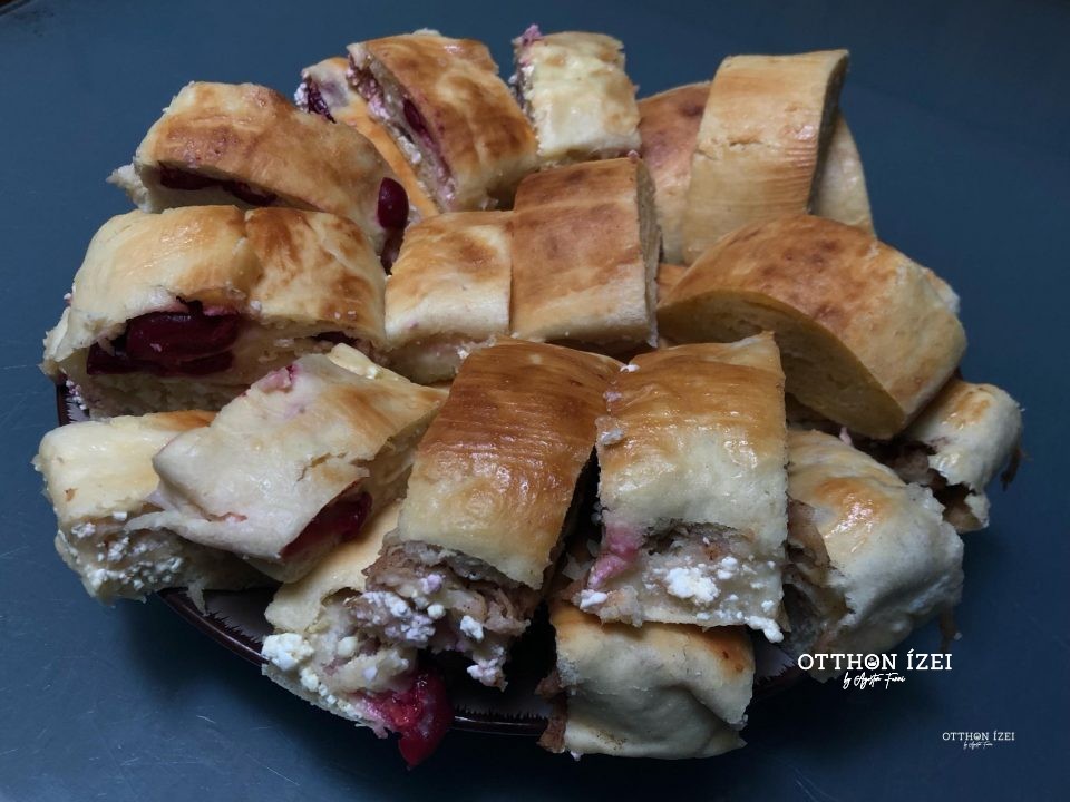 • A kelesztést követően 4 egyforma cipóra osztjuk. Lisztezett deszkán a lehető legvékonyabbra nyújtjuk. Ha nyújtófával már nem tudjuk vékonyabbra, akkor érdemes kézzel is finoman húzni rajta, mert engedni fog a tészta. Ízlés szerinti töltelékkel töltjük (túró, alma, meggy, túró-meggy…).